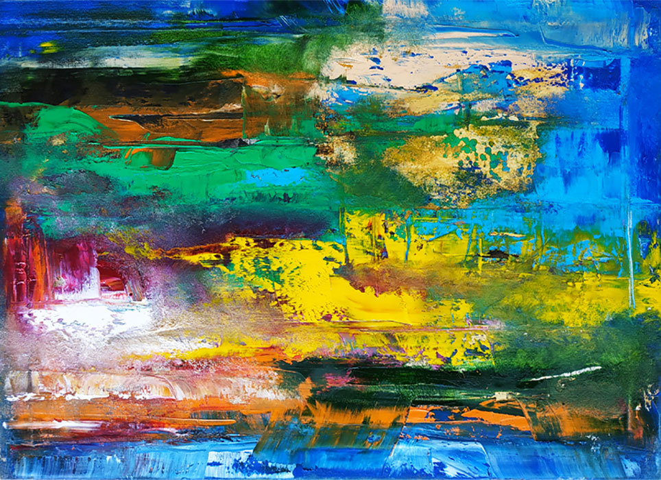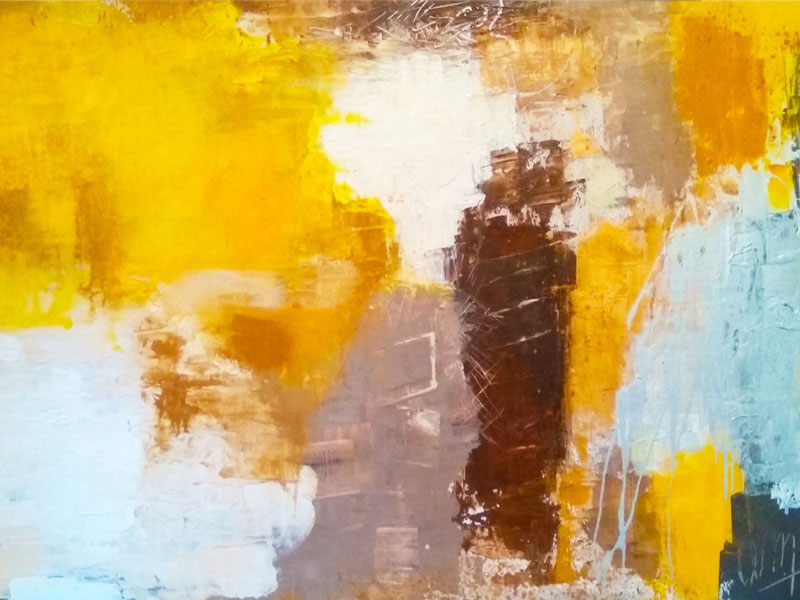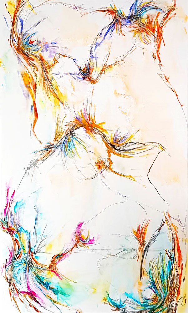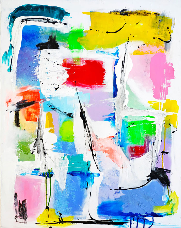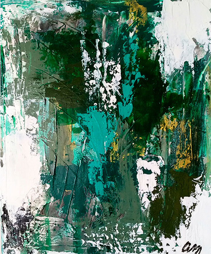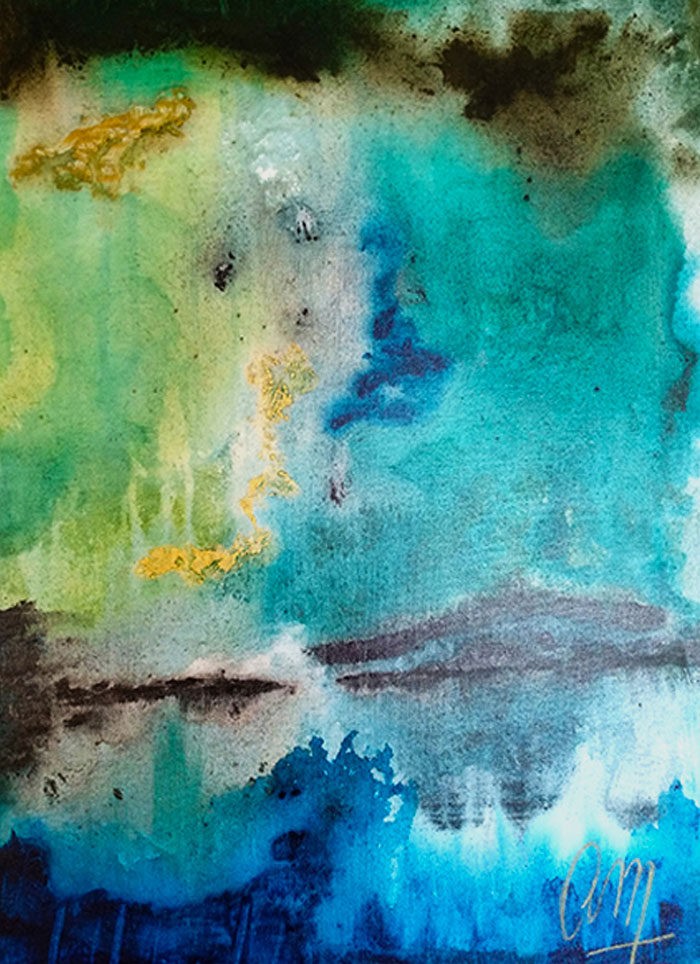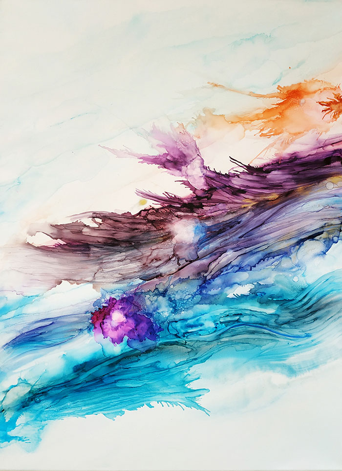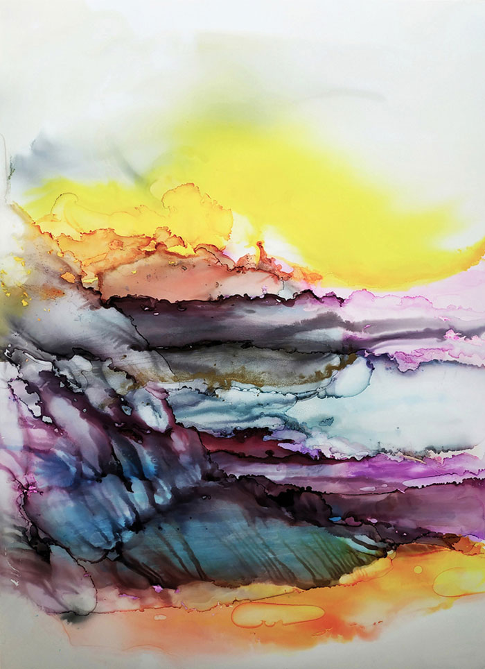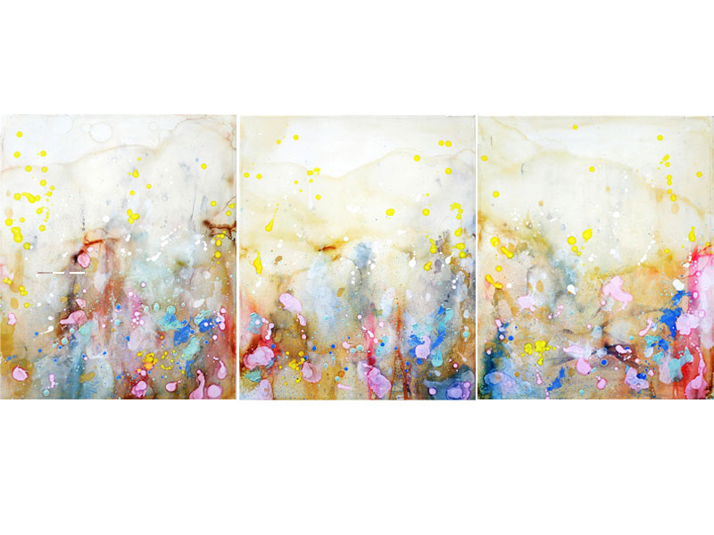 La colección TECKNICOLOR esta inspirada en la naturaleza y las sensaciones que me transmite, sea por los recuerdos de algún viaje, los olores, los colores y todo lo que en su conjunto percibo de la tierra. Se caracteriza por mezclar diferentes técnicas; movimientos fluidos, trazos fuertes, dirigidos y enmascarar algunas zonas para dejarlas sin pintura.