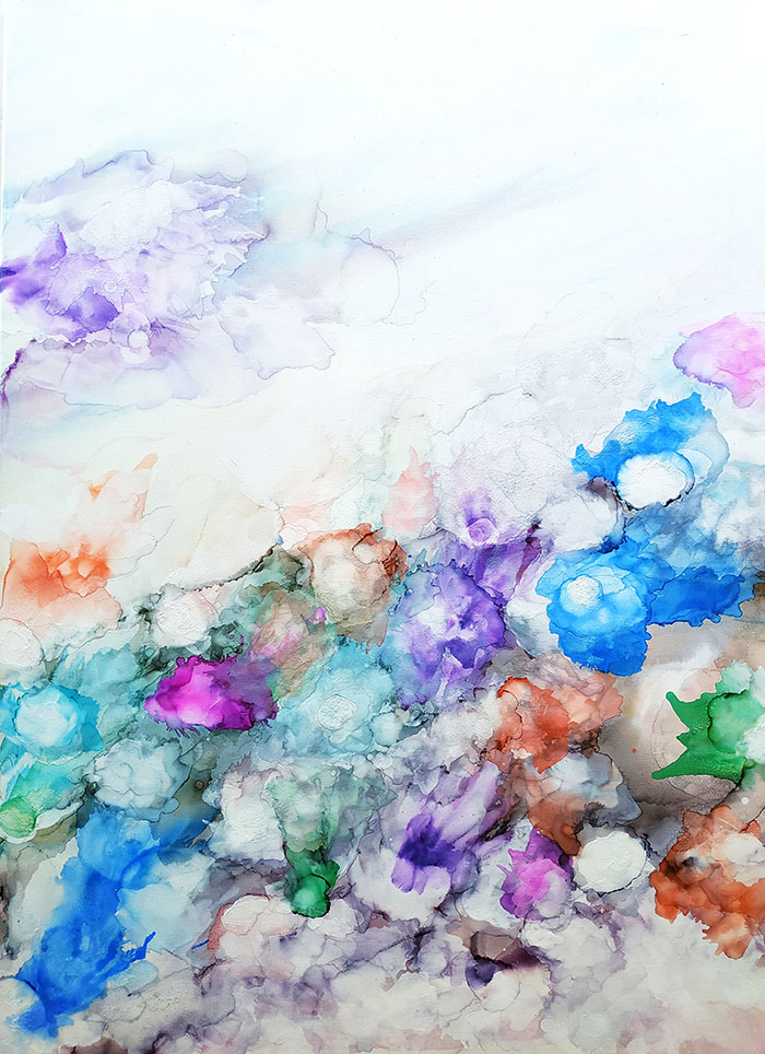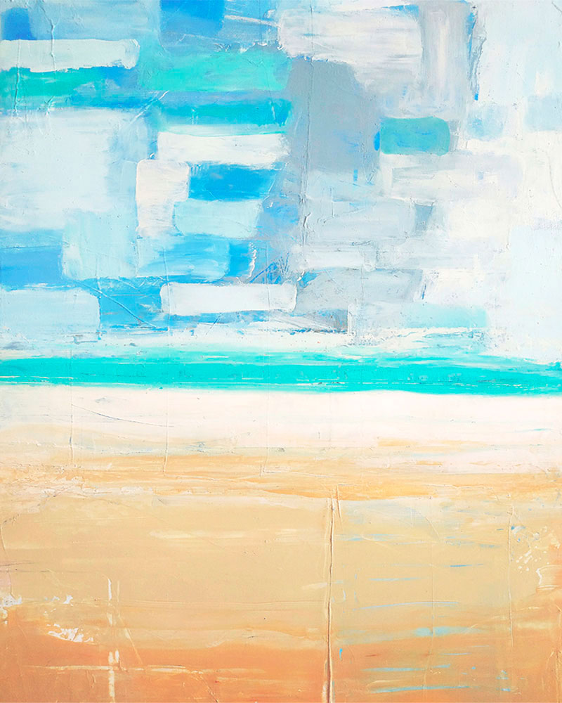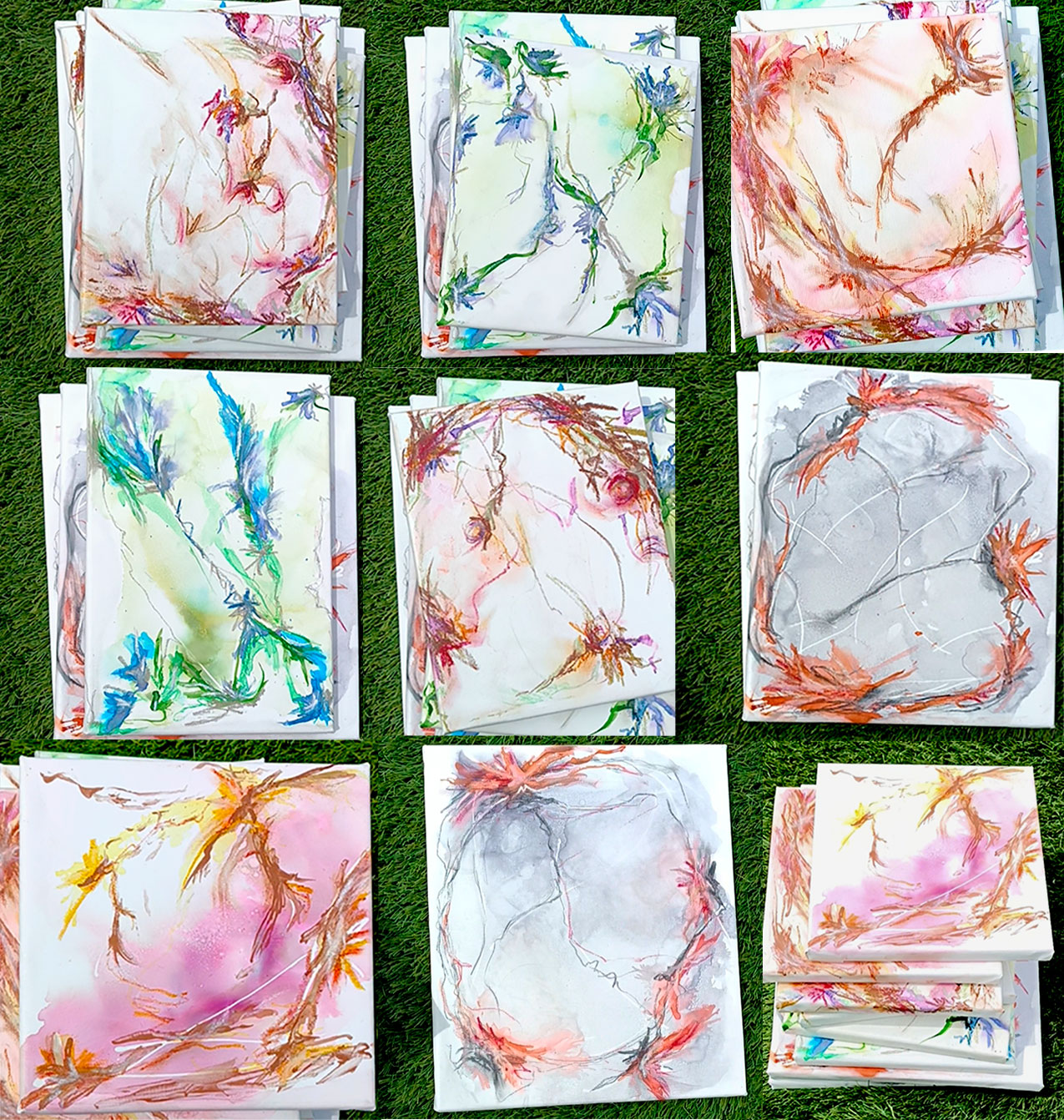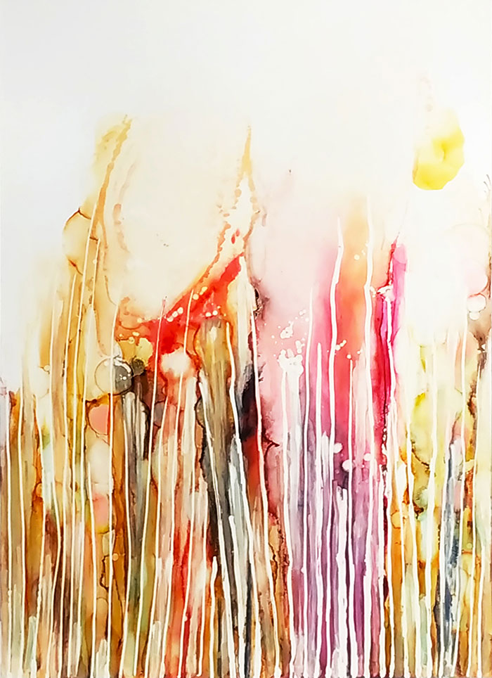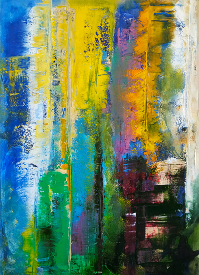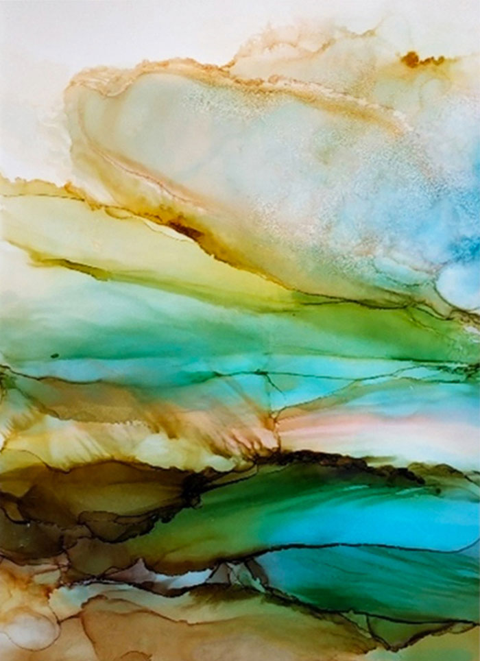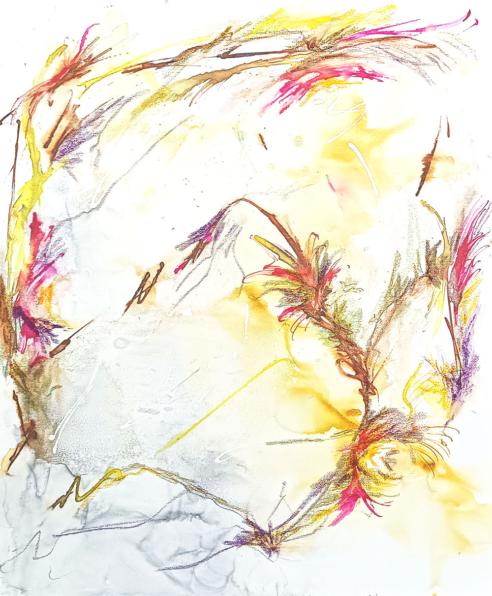 La colección TECKNICOLOR esta inspirada en la naturaleza y las sensaciones que me transmite, sea por los recuerdos de algún viaje, los olores, los colores y todo lo que en su conjunto percibo de la tierra. Se caracteriza por mezclar diferentes técnicas; movimientos fluidos, trazos fuertes, dirigidos y enmascarar algunas zonas para dejarlas sin pintura.