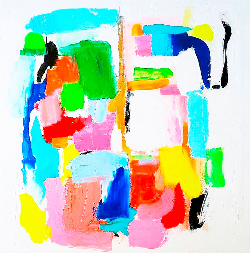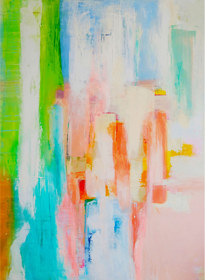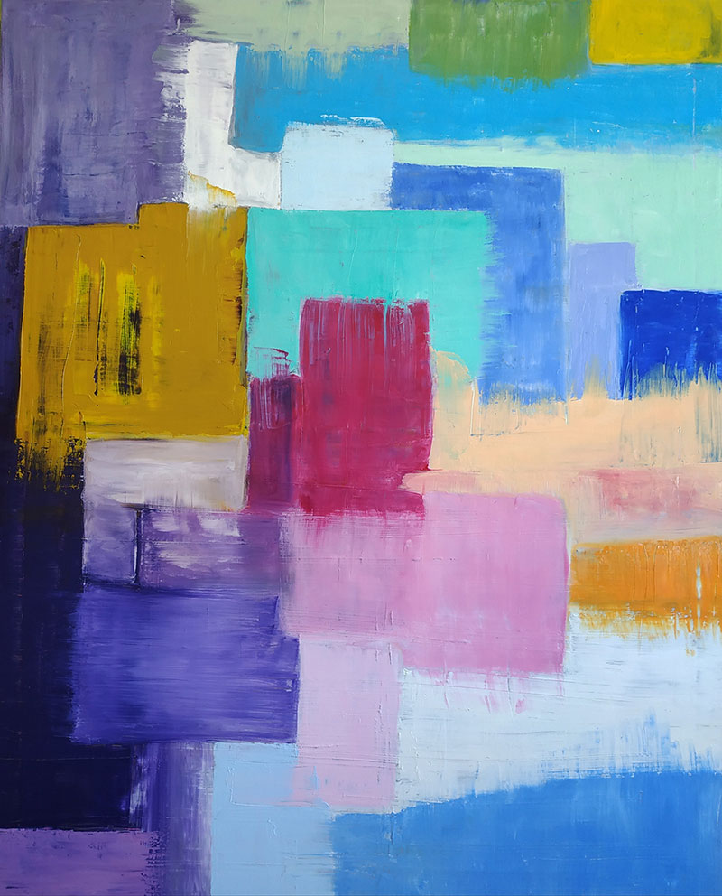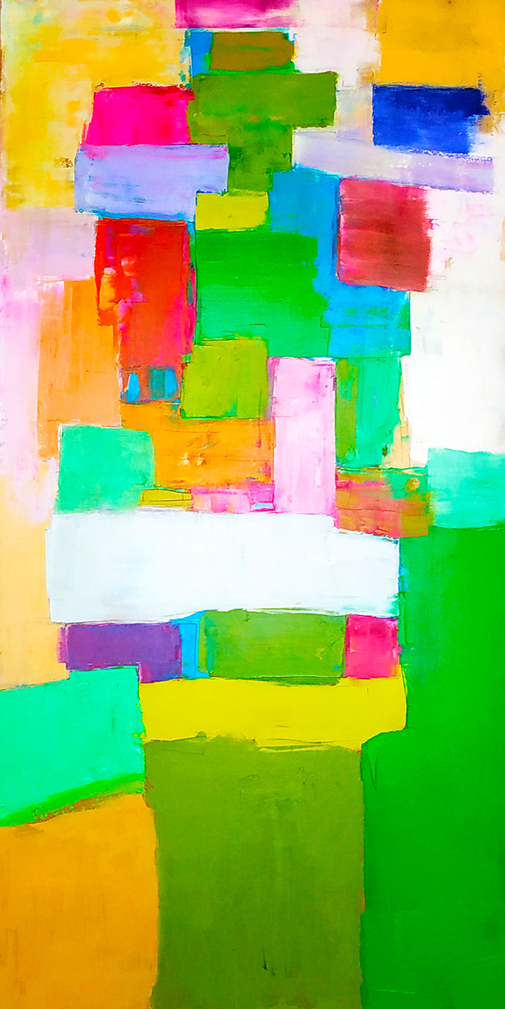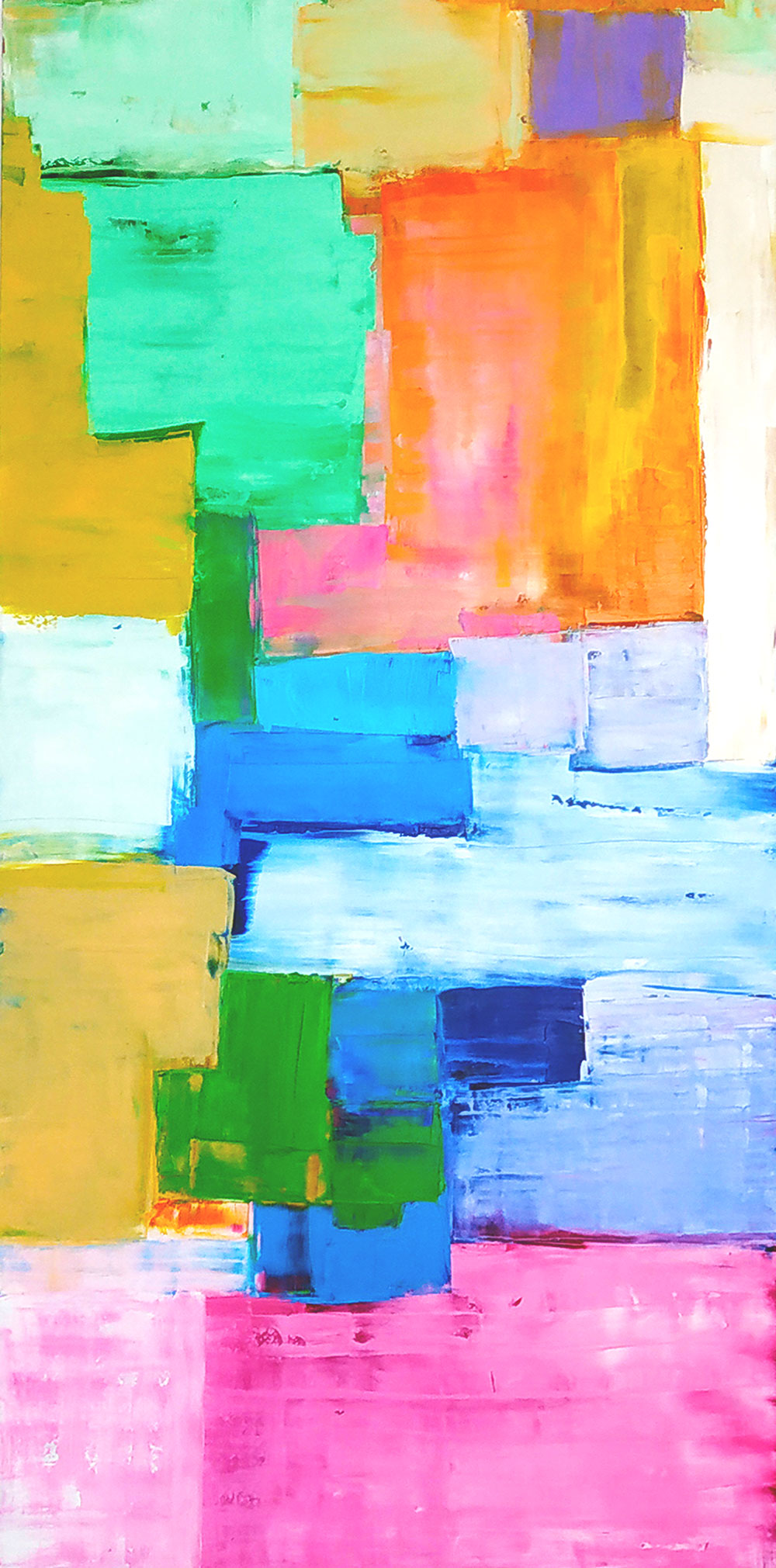 Inspirada en la felicidad! Expreso en HAPPINESS el sentido de la felicidad, que no es un todo, sino que esta lograda por un conjunto de pequeños momentos de mi vida. Motivada hacia una tendencia a eliminar lo que me distrae de aquello que es importante en mi vida, algunas pinturas las transformo en obras minimalistas, que se caracterizan por las formas geométricas mínimas en franjas amplias de colores, dejando a la vista espacios sin cubrir y errores visibles, integrados en la pintura.
