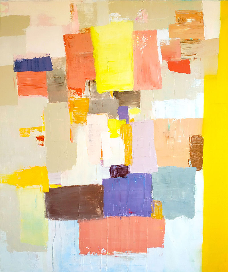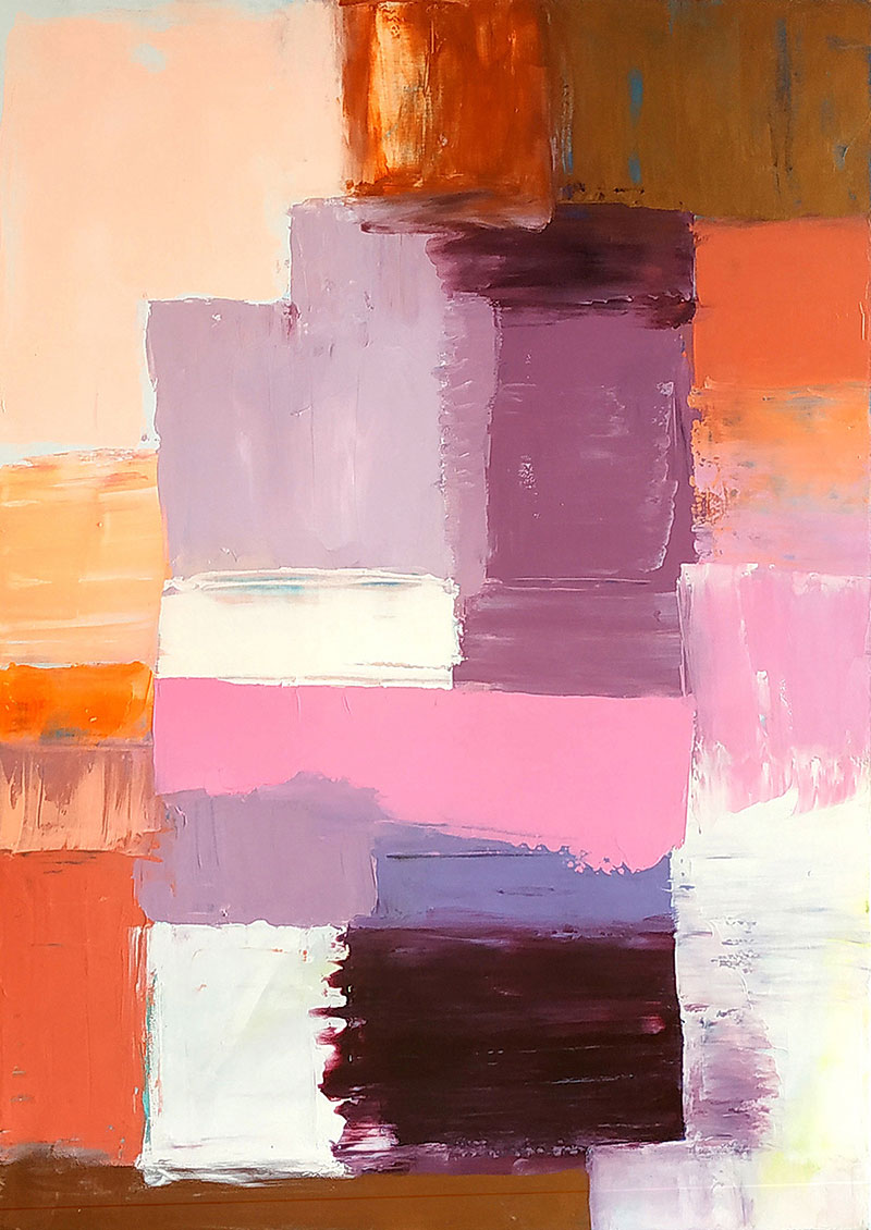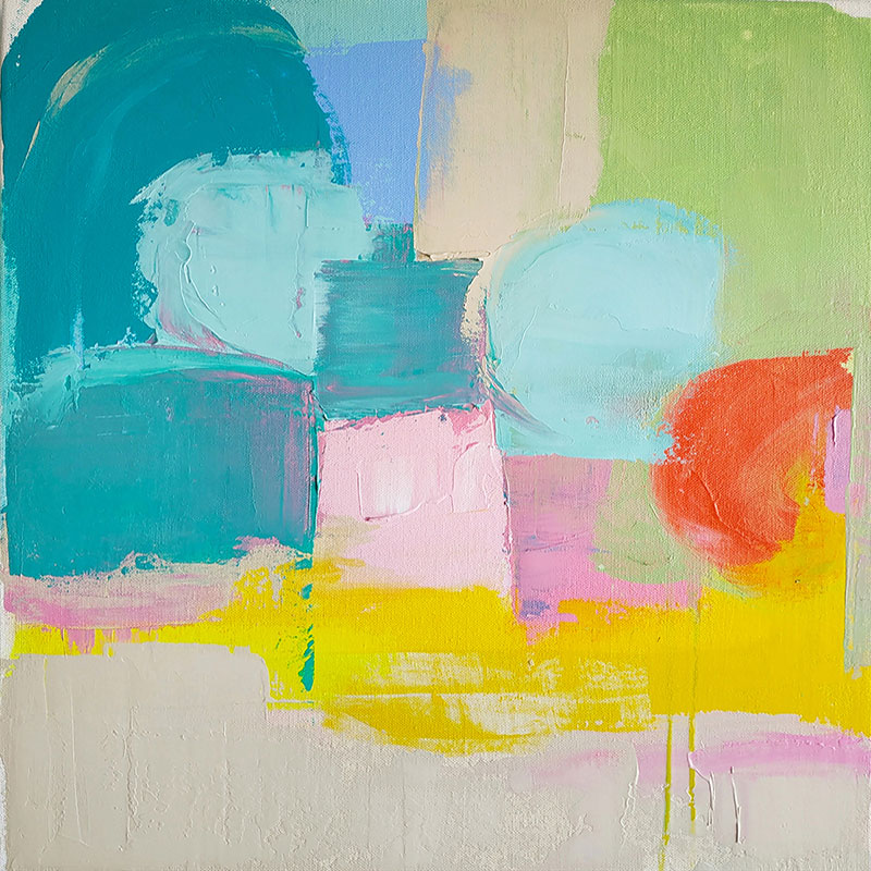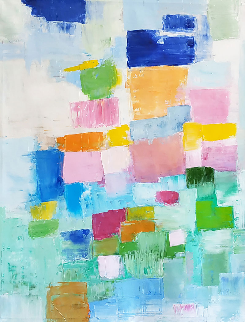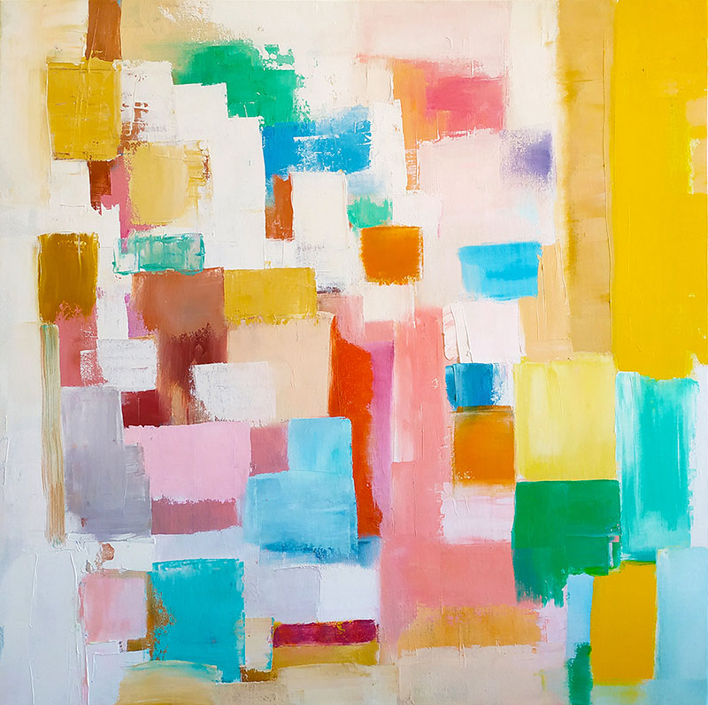 Inspirada en la felicidad! Expreso en HAPPINESS el sentido de la felicidad, que no es un todo, sino que esta lograda por un conjunto de pequeños momentos de mi vida. Motivada hacia una tendencia a eliminar lo que me distrae de aquello que es importante en mi vida, algunas pinturas las transformo en obras minimalistas, que se caracterizan por las formas geométricas mínimas en franjas amplias de colores, dejando a la vista espacios sin cubrir y errores visibles, integrados en la pintura.